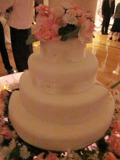 3 tier floating cake, fondant, silk flowers and ribbon.